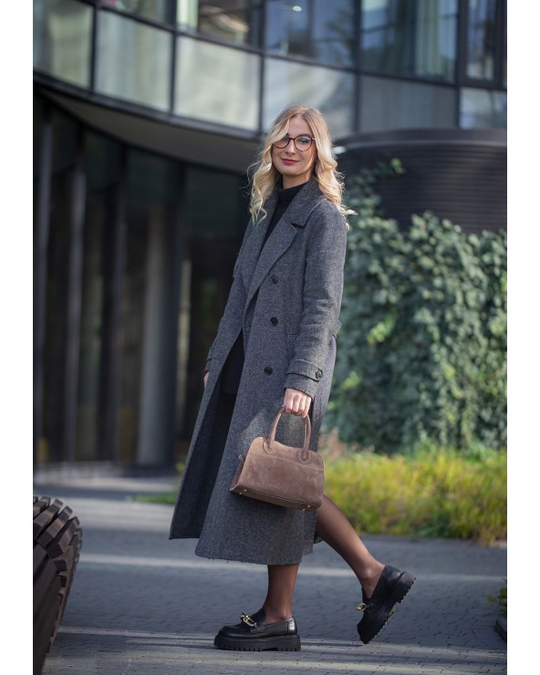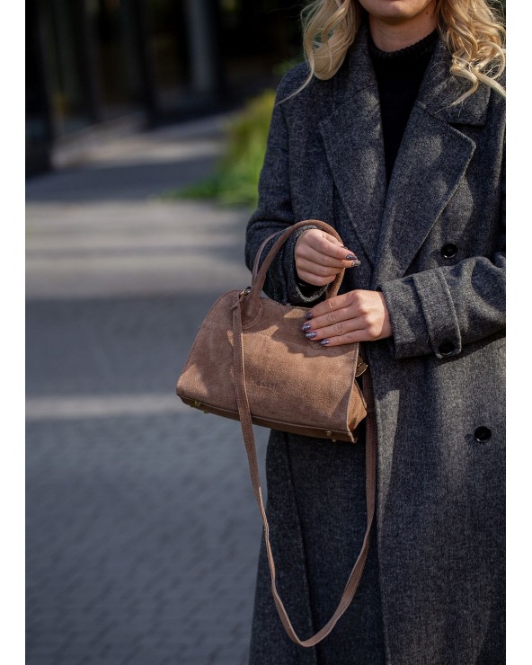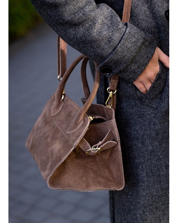 Mała zamszowa torebka a'la Polene taupe to torebka włoskiej produkcji wykonana z naturalnej skóry. Torebka jest włoskiej produkcji, posiada uchwyt do noszenia do ręki oraz długie paski-na ramię. Torebka posiada podszewkę. Boki można zwężać szlufką.